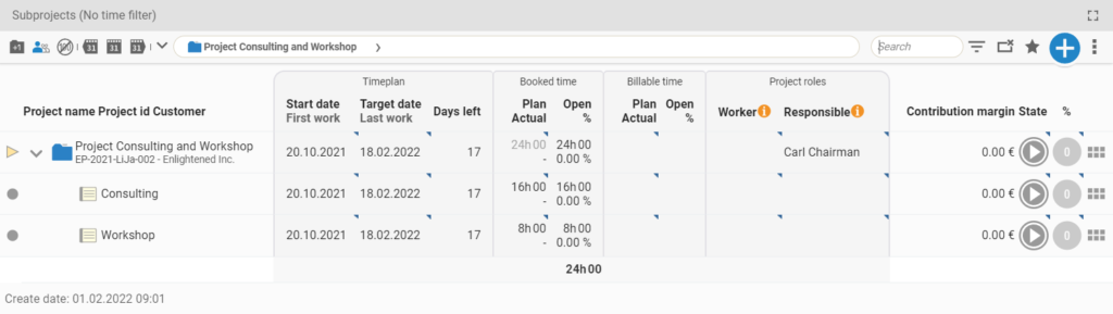 teamspace supports you with the time budget by transferring relevant information from the order to the project. For example, the work package consulting automatically receives a time budget of 16 hours and the workshop of 8 hours. This corresponds to the values that were offered to the customer for the services.